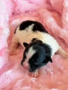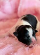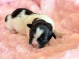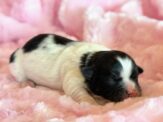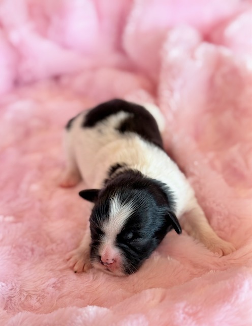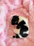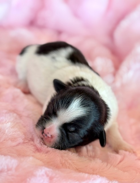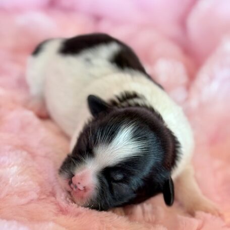 Bella is an adorable little Malshi! Her parents are Macy and Tiny, our registered Shih Tzu and Maltese. I expect her to weigh around 8-9 lbs when full grown, she has a beautiful non-shedding white and black coat! Bella will be ready for a family around June 2, she can be reserved now.