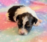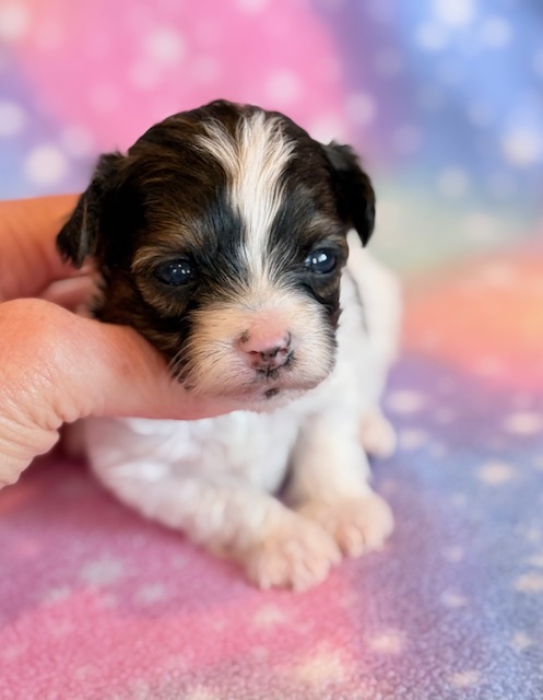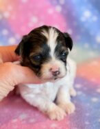 Candy is a precious little MaltiPoo! Her parents are Trixie and Jade, our registered Maltese and Toy Poodle. I expect her to weigh around 6 lbs when full grown, she has a beautiful multi-colored non-shedding coat! Candy will be ready for a family around June 4, she can be reserved now.