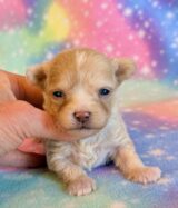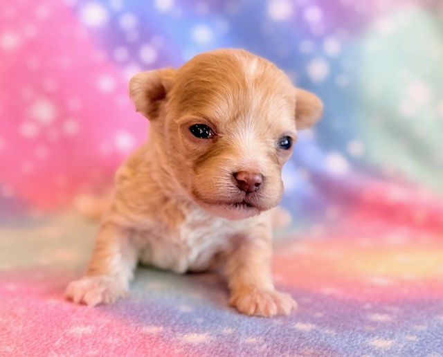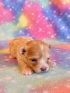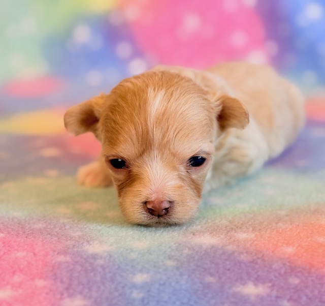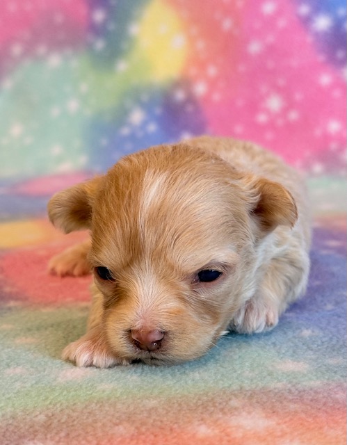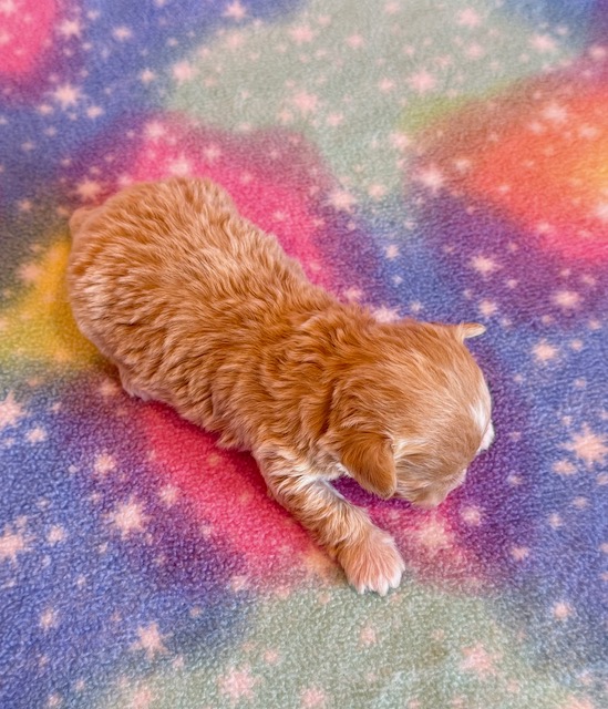 Charlie is reserved for Barbara! Charlie is a sweet little MaltiPoo! Her parents are Trixie and Jade, our registered Maltese and Toy Poodle. I expect her to weigh around 6 lbs when full grown, she has a beautiful apricot non-shedding coat! Charlie will be ready for her family around June 4.