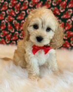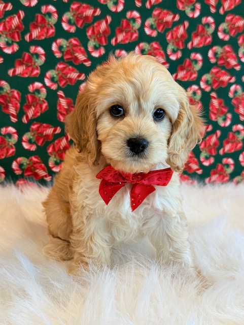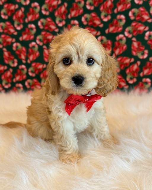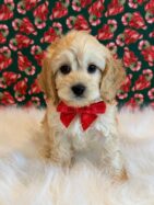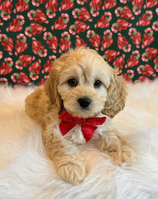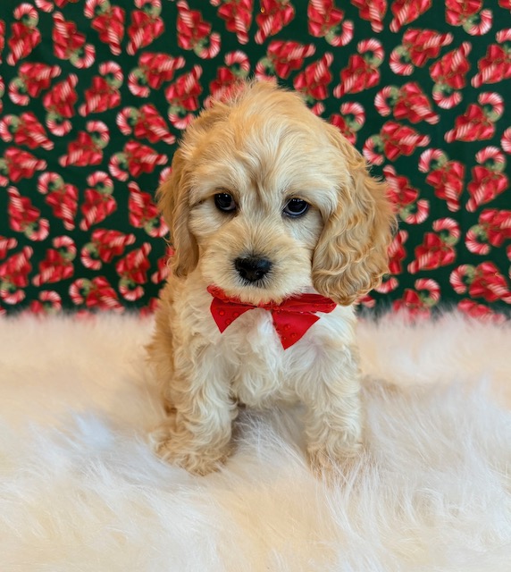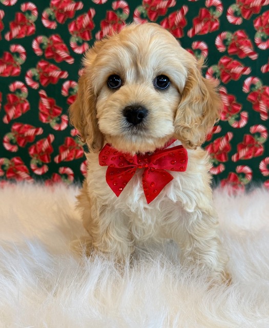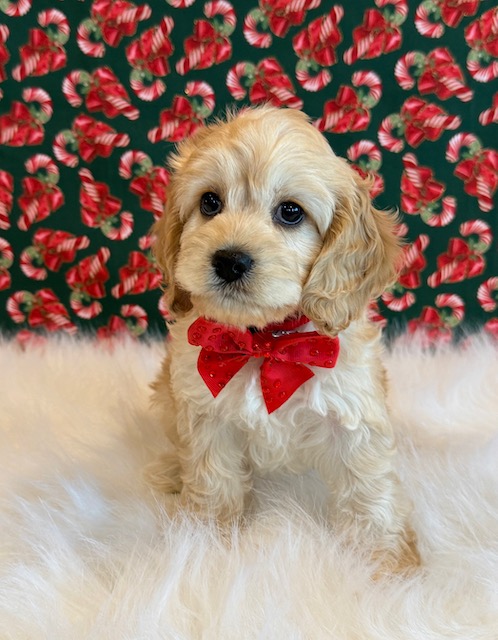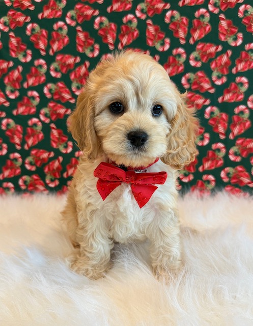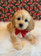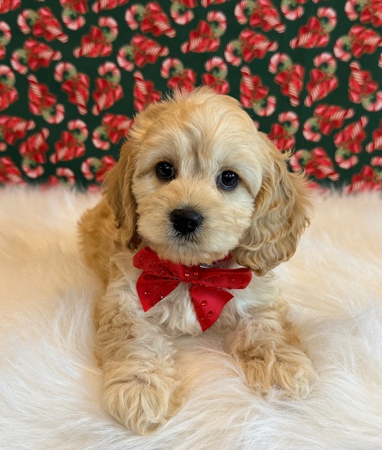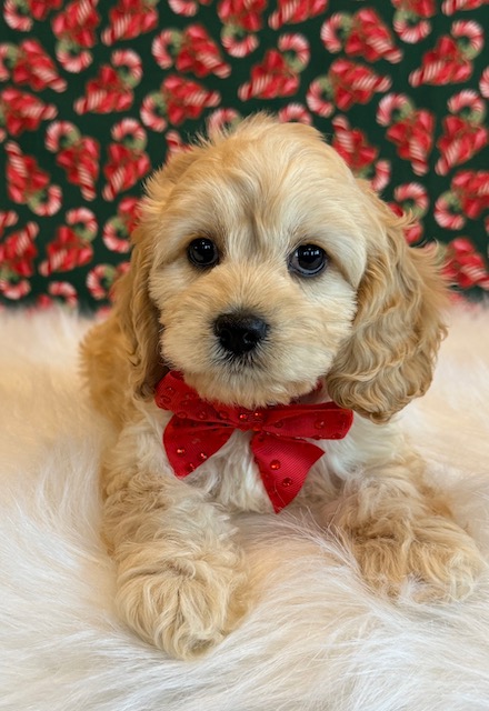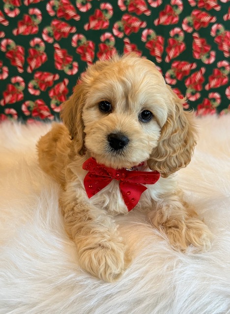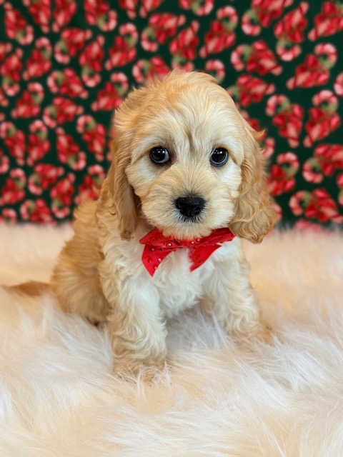 Daphne is an adorable little Cockapoo! Her parents are Cassie(18 lbs) and Homer(9 lbs), our registered Cocker Spaniel and Toy Poodle. I expect her to weigh around 14 lbs when full grown. She has a beautiful non-shedding buff colored coat! Daphne will be ready for a family around December 4, she can be reserved now.