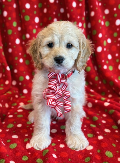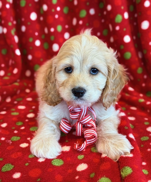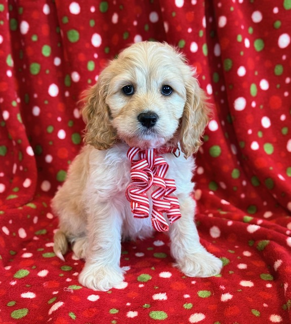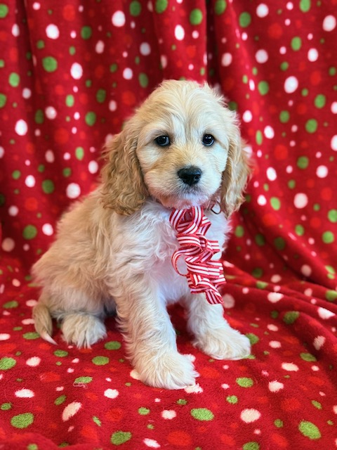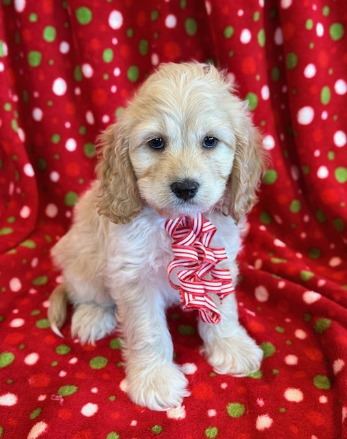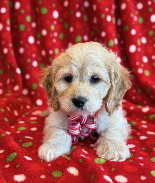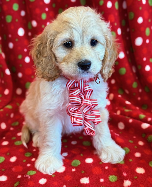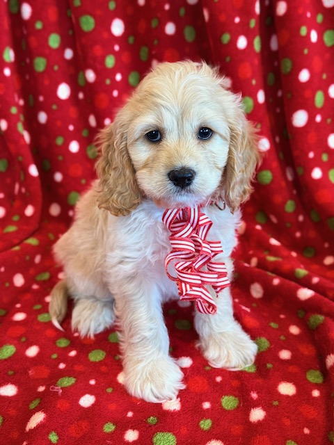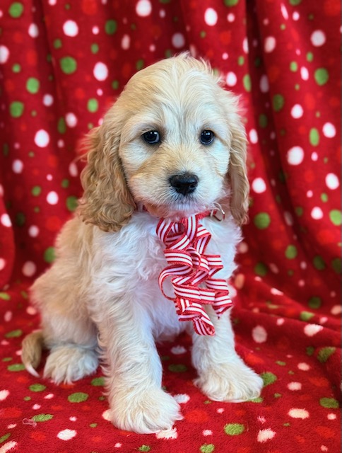 Denali is a handsome little Cockapoo! His parents are Cassie(18 lbs) and Homer(9 lbs), our registered Cocker Spaniel and Toy Poodle. I expect him to weigh around 14-15 lbs when full grown. He has a beautiful non-shedding buff coat! Denali will be ready for a family around December 4, he can be reserved now.