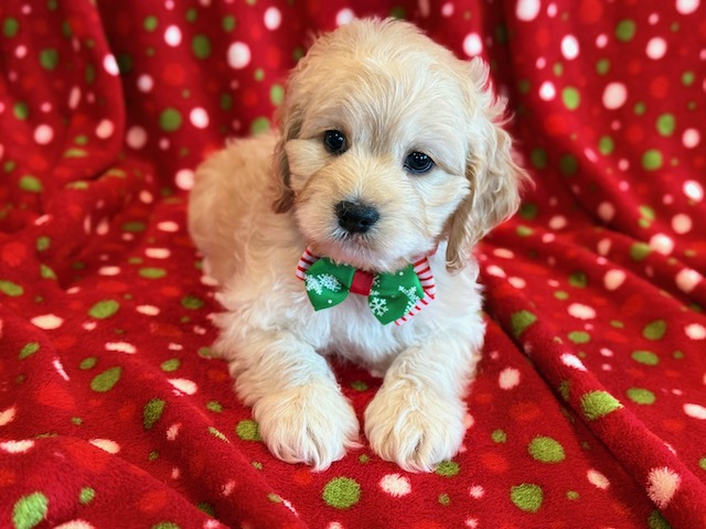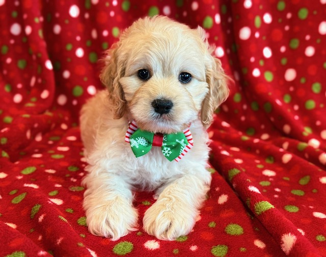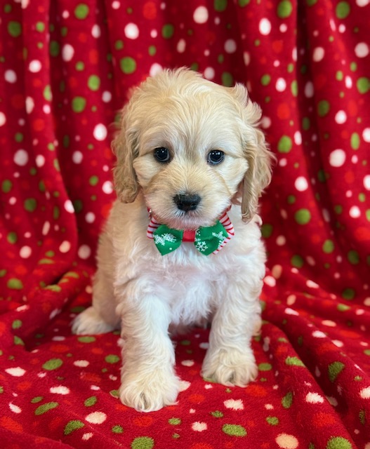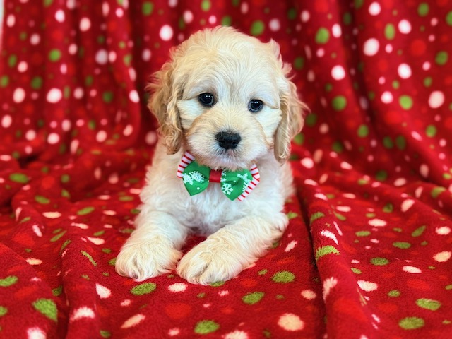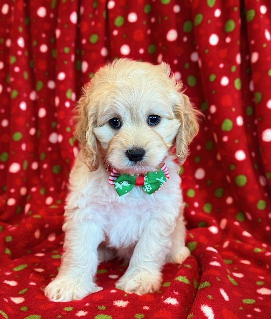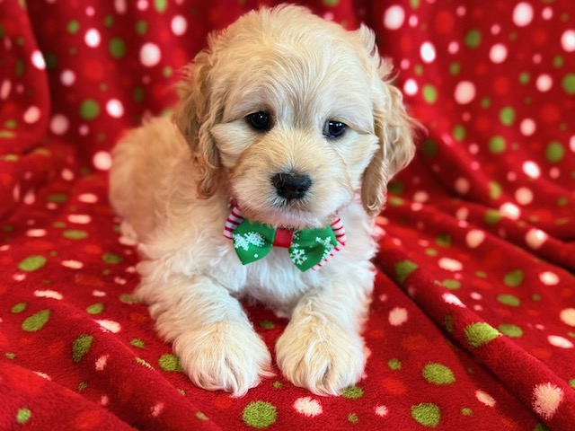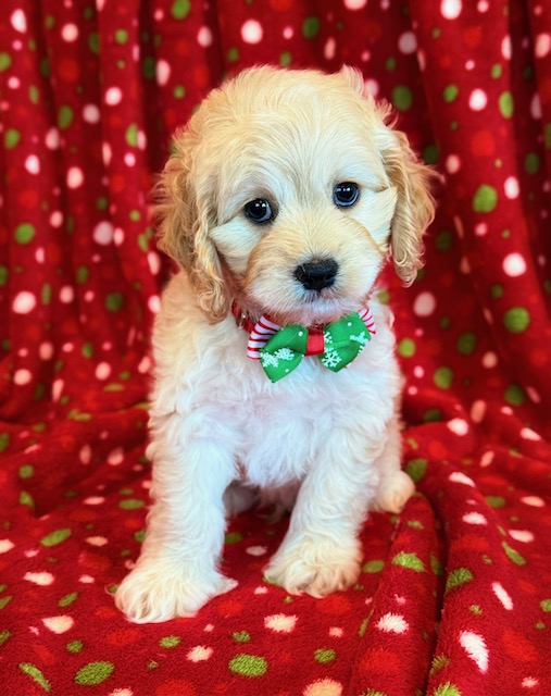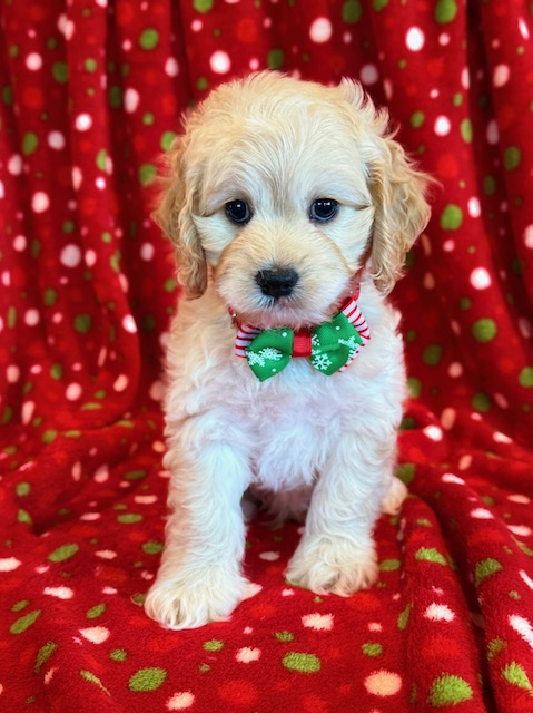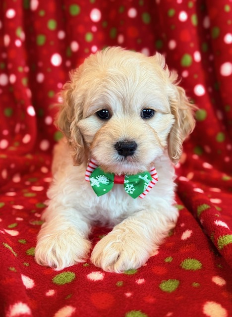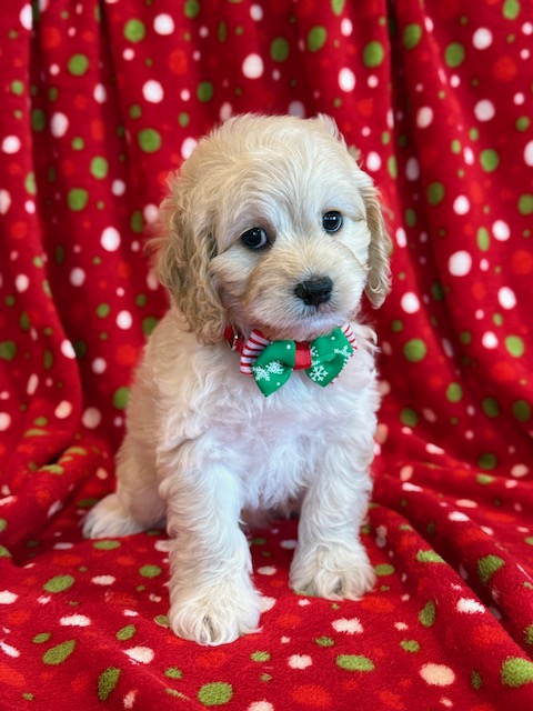 Dexter is a handsome little Cockapoo! His parents are Cassie(18 lbs) and Homer(9 lbs), our registered Cocker Spaniel and Toy Poodle. I expect him to weigh around 14 lbs when full grown. He has a beautiful non-shedding buff colored coat with white markings! Dexter will be ready for a family around December 4, he can be reserved now.