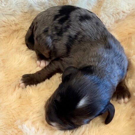 Elmo is a handsome little Cockapoo! His parents are Carly and Jetta, our registered Cocker Spaniel and Miniature Poodle. I expect him to weigh around 18-20 lbs when full grown, he has a beautiful non-shedding blue merle coat with some white markings! Elmo will be ready for a family around June 18, he can be reserved now.
