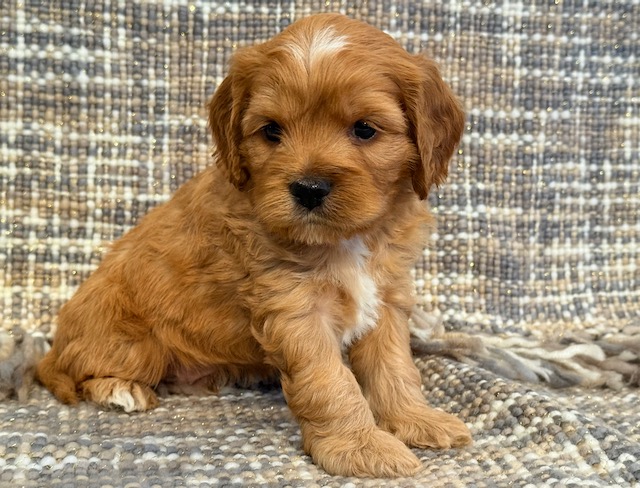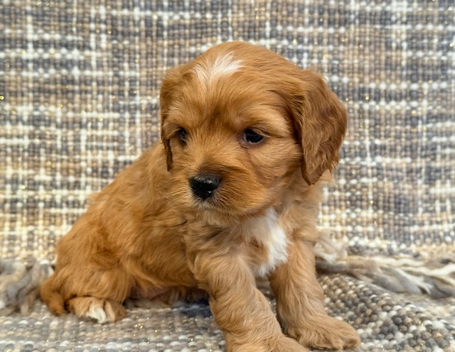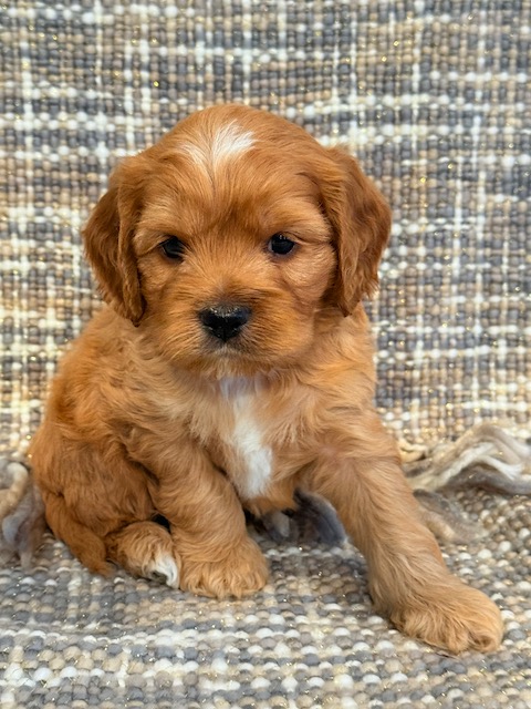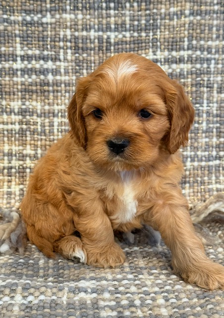 Elvis is an adorable little Cockapoo! His parents are Catalina(18 lbs) and Herbie(14 lbs), our registered Cocker Spaniel and Miniature Poodle. I expect him to weigh around 15-17 lbs when full grown. He has a beautiful non-shedding red coat! Elvis will be ready for a family around December 4, he can be reserved now.