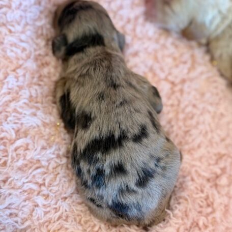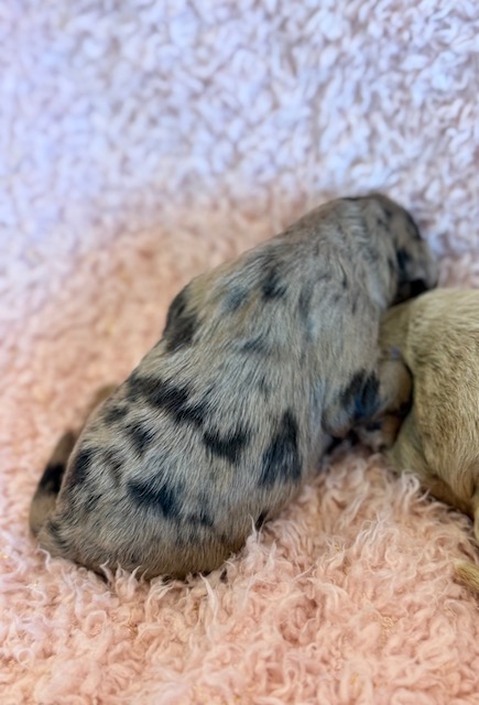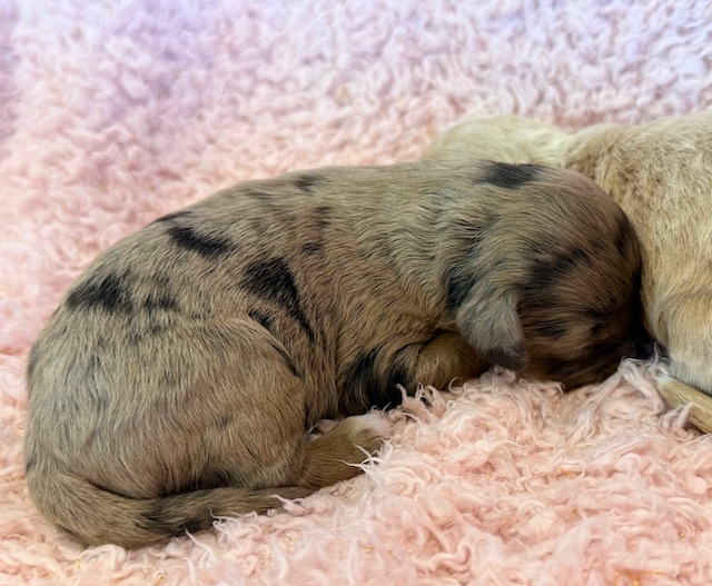 EmmyLou is a unique and beautiful little Cockapoo! Her parents are Carly and Jetta, our registered Cocker Spaniel and Miniature Poodle. I expect her to weigh around 17-19 lbs when full grown, she has a beautiful non-shedding chocolate merle coat with some white markings! EmmyLou will be ready for a family around June 18, she can be reserved now.