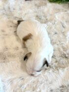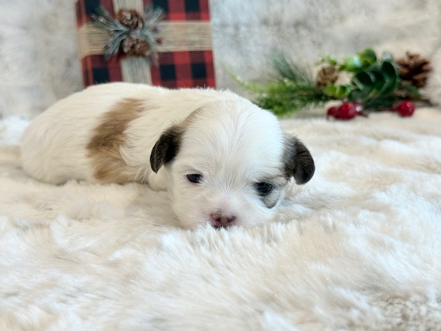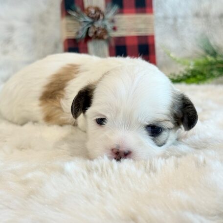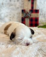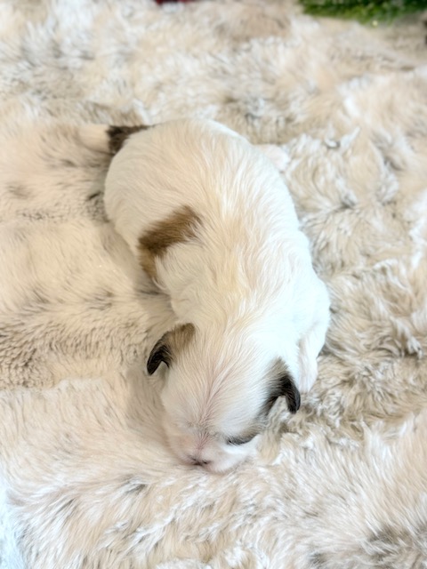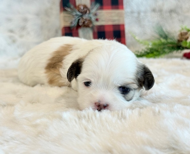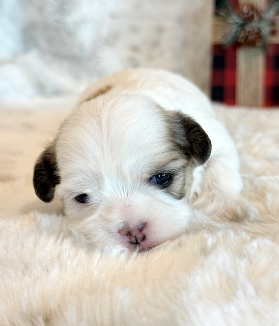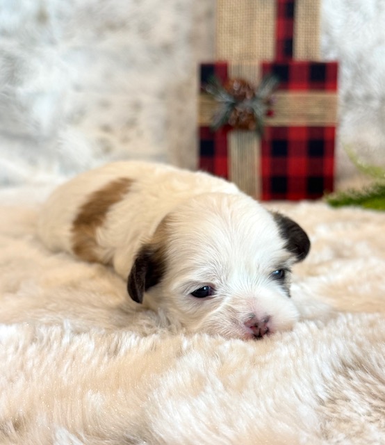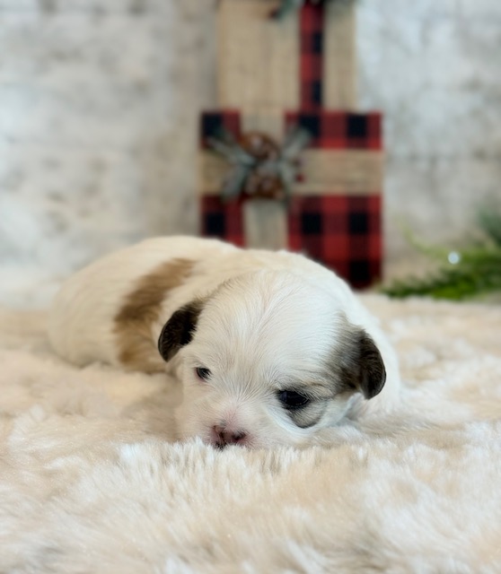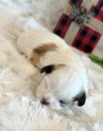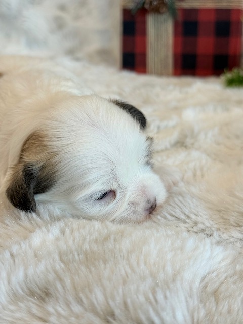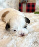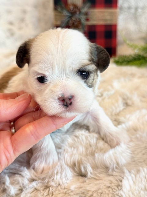 Francie is a precious little Malshi! Her parents are Mia and Tinker, our registered ShihTzu and Maltese. I expect Francie to weigh around 8-10 lbs when full grown. She has a beautiful non-shedding coat. She will be ready for a family around Jan. 9, she can be reserved now.