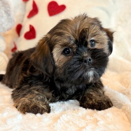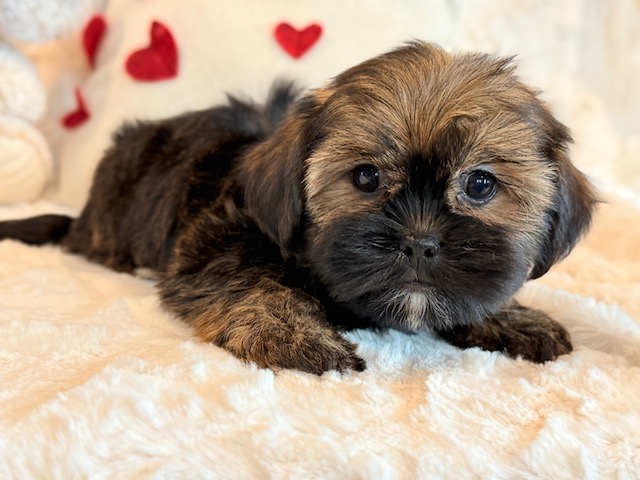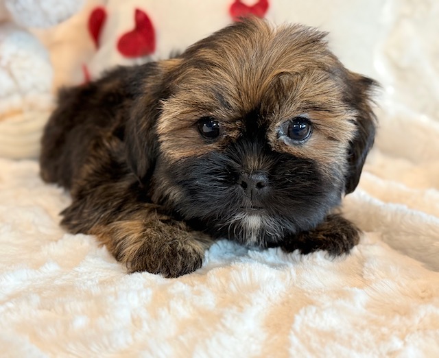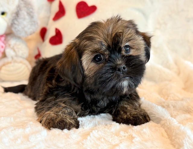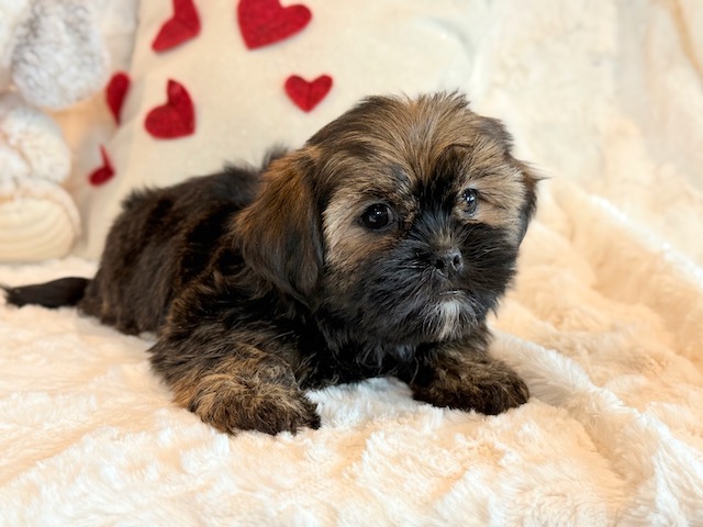Graham is a sweet little Shorkie! His parents are MaKenna and Bingo, our registered ShihTzu and Yorkie. I expect Graham to weigh around 10 lbs when full grown. He has a beautiful non-shedding coat. He is ready for a family now.