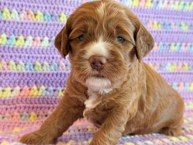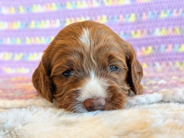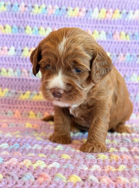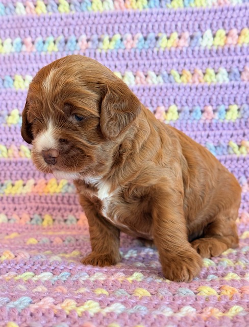 Mazy is an awesome little red Cockapoo! Her parents are Caroline and Jetta, our registered Cocker Spaniel and Miniature Poodle. I expect her to weigh around 18-20 lbs when full grown. Mazy will be ready to go around Feb. 3, she can be reserved now.