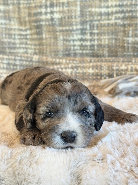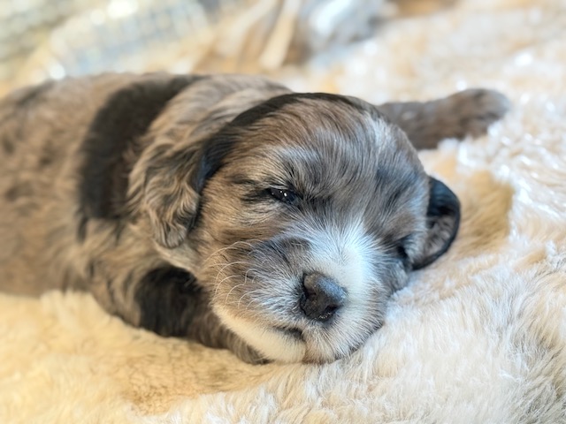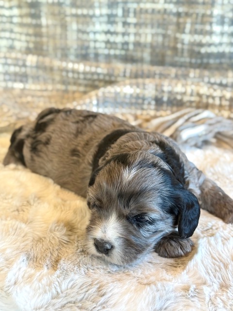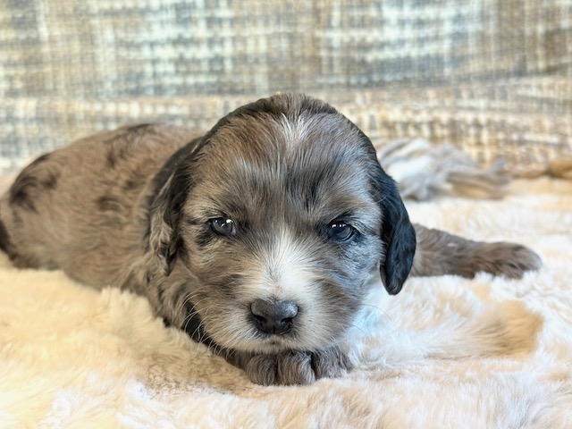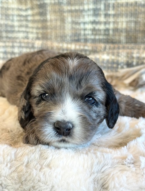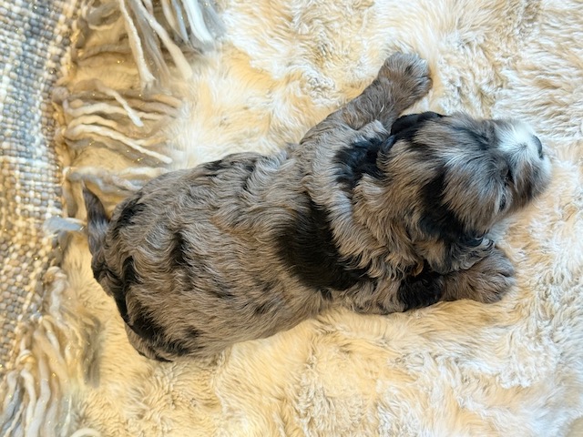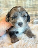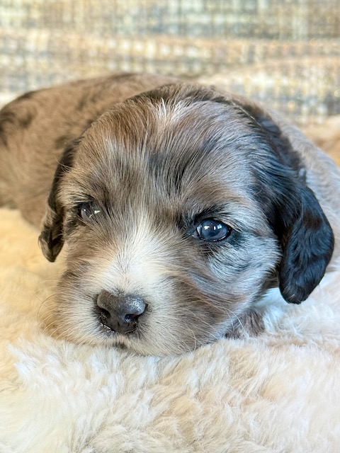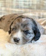 Miller is a gorgeous blue merle Cockapoo! His parents are Caroline and Jetta, our registered Cocker Spaniel and Miniature Poodle. I expect him to weigh around 18-20 lbs when full grown. Miller will be ready to go around Feb. 3, he can be reserved now.