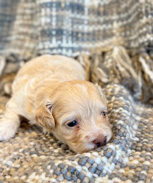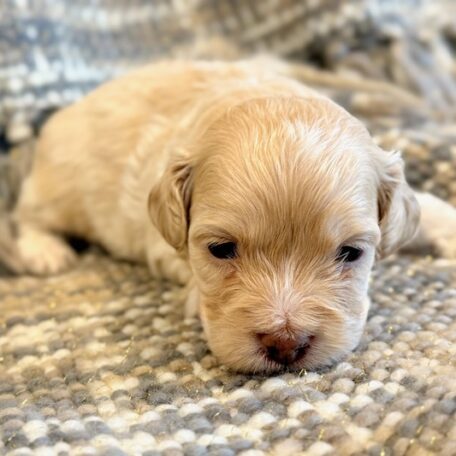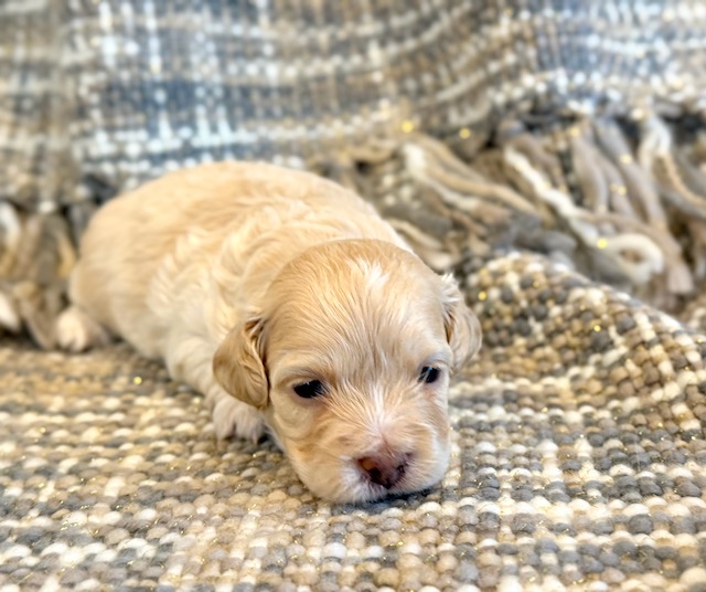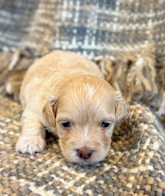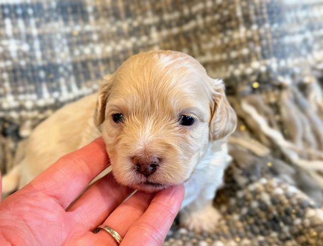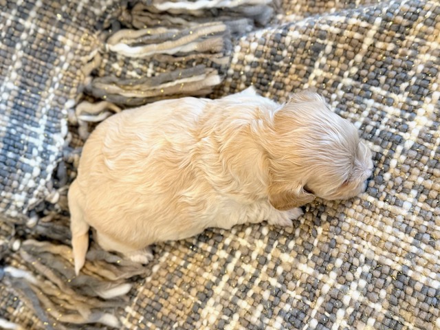 Paddington is a sweet little Cockapoo! His parents are Goldie and Jace, our Cockapoo and Toy Poodle. I expect him to weigh around 11-14 lbs when full grown. Paddington will be ready to go around Feb. 25, he can be reserved now.