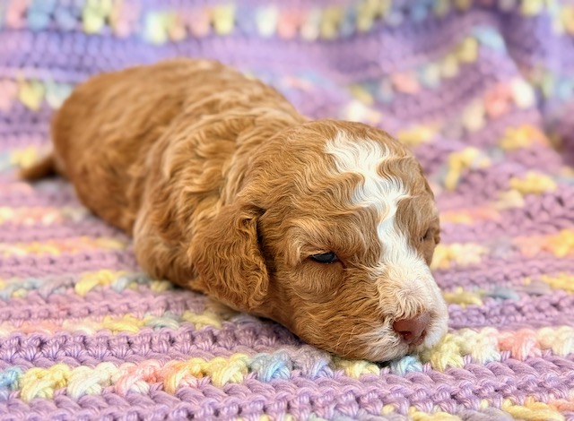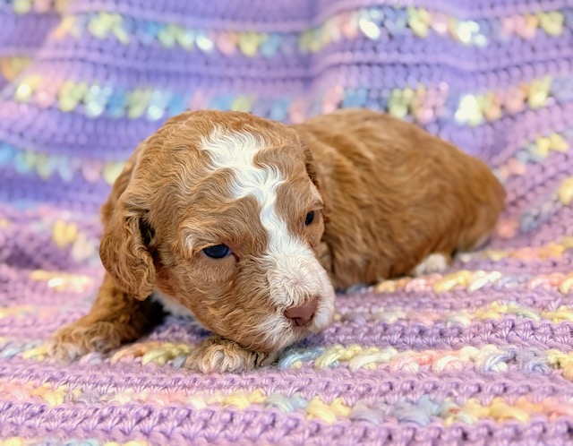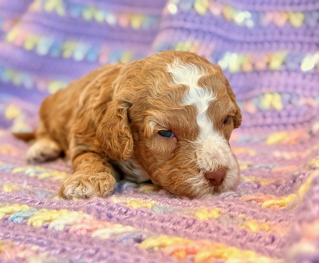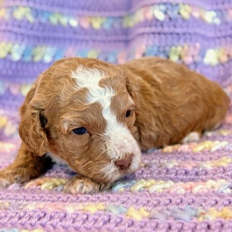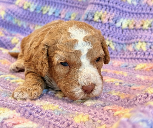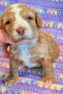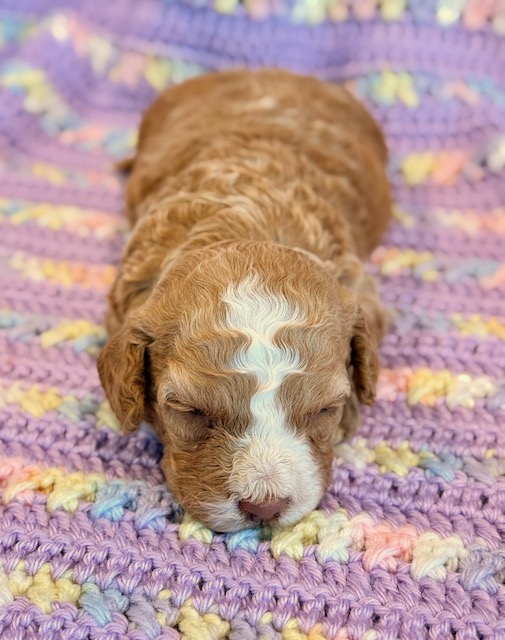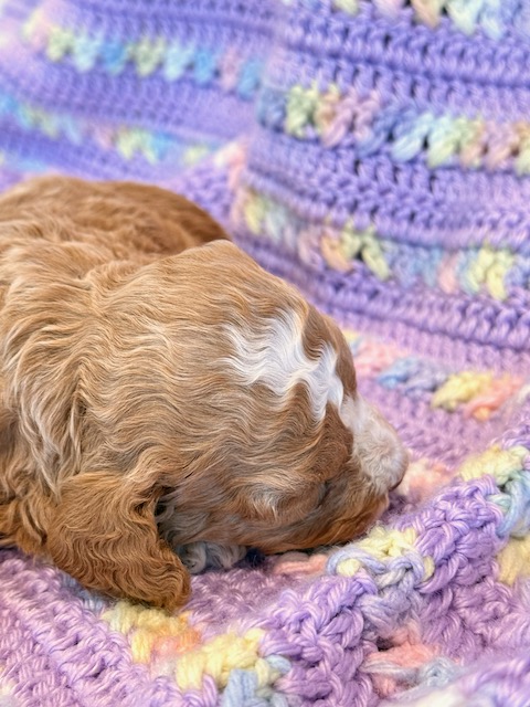 Piper is a sweet little Cockapoo! Her parents are Goldie and Jace, our Cockapoo and Toy Poodle. I expect her to weigh around 11-13 lbs when full grown. Piper will be ready to go around Feb. 25, she can be reserved now.