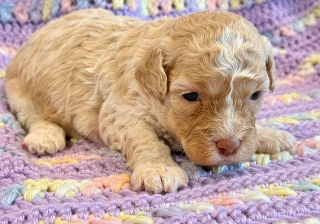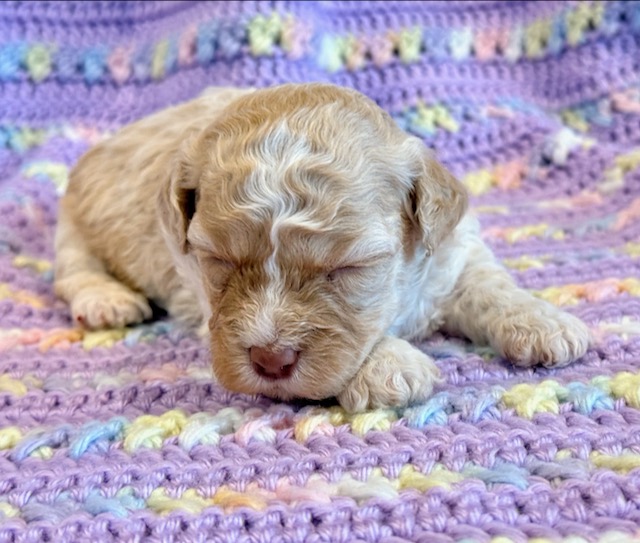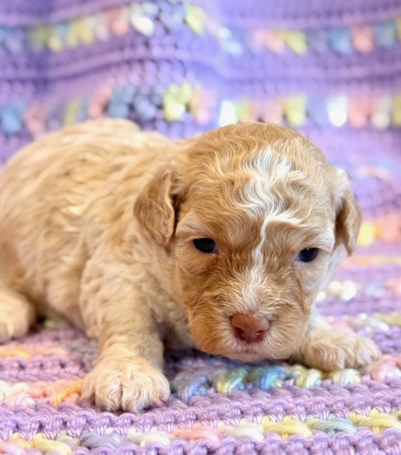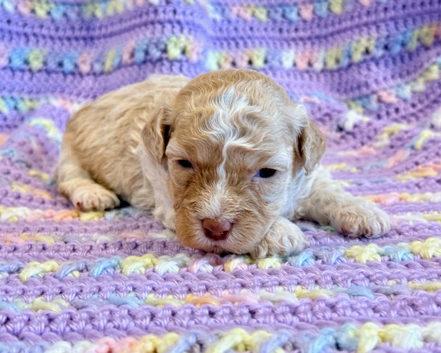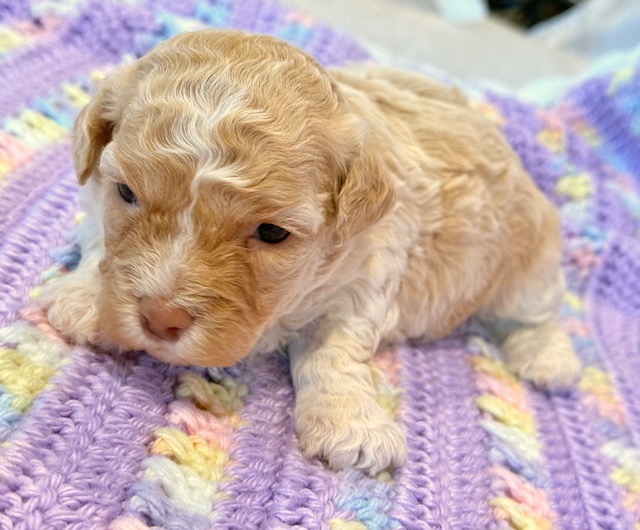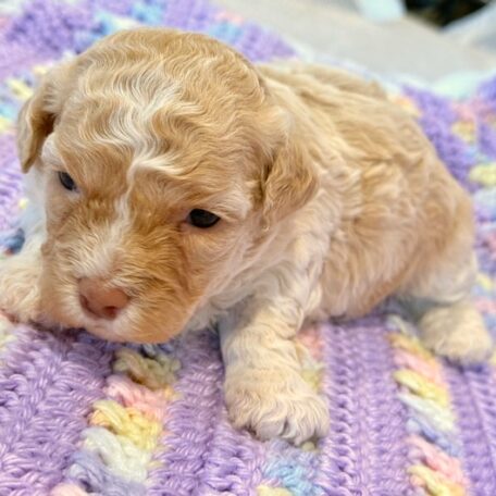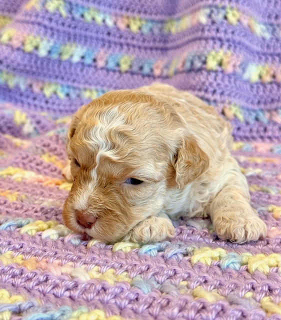 Pixie is an awesome little Cockapoo! Her parents are Goldie and Jace, our Cockapoo and Toy Poodle. I expect her to weigh around 11-13 lbs when full grown. Pixie will be ready to go around Feb. 25, she can be reserved now.