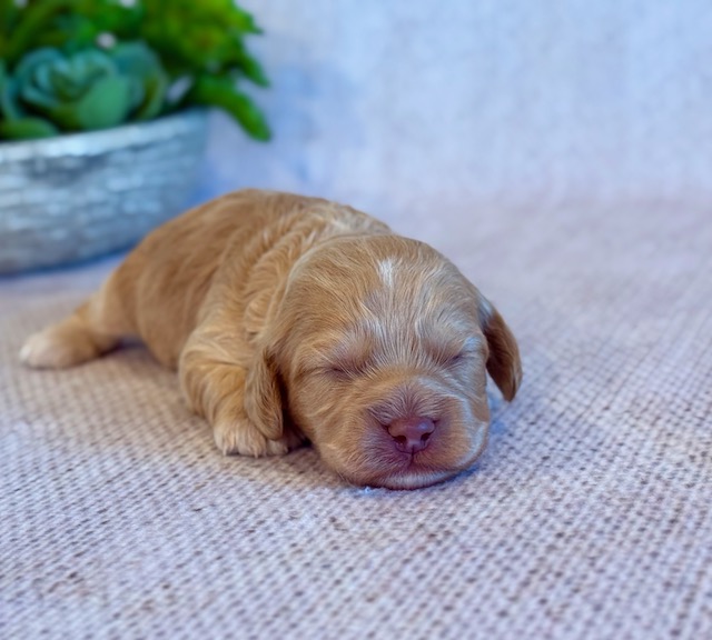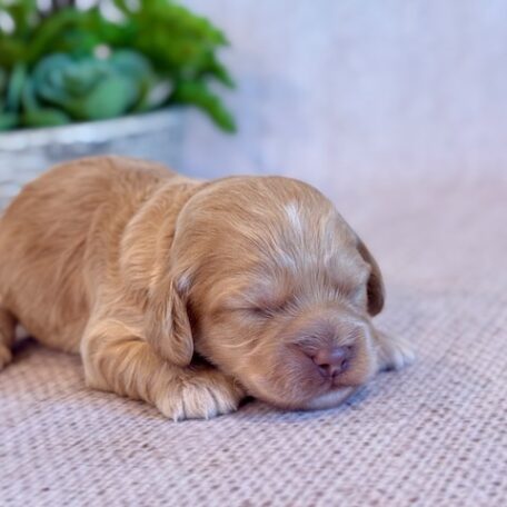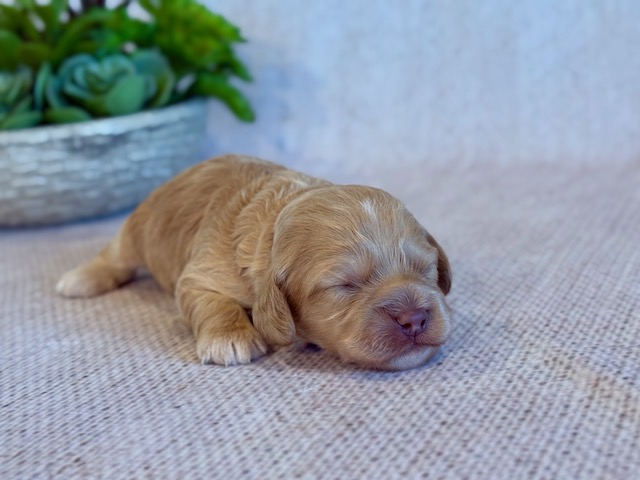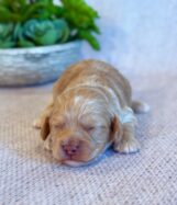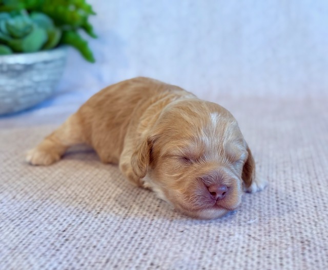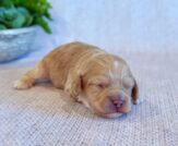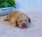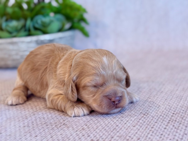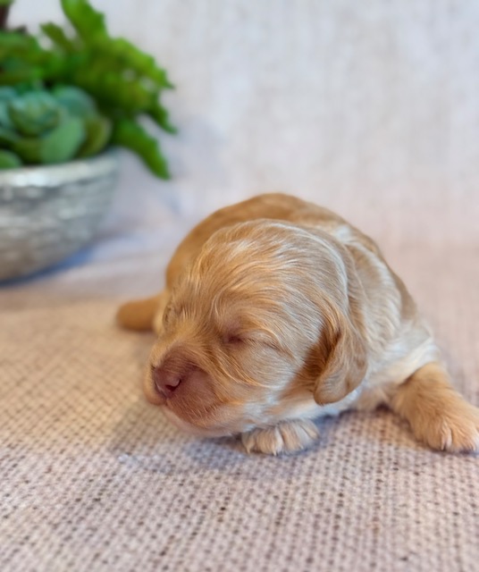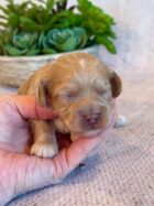 Ringo is a precious little Cockapoo! His parents are Cameo and Hunter, our registered Cocker Spaniel and Toy Poodle. I expect him to weigh around 11-14 lbs when full grown, he has a beautiful bright apricot non-shedding coat!. Ringo will be ready for a family around April 18, he can be reserved now.