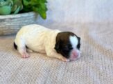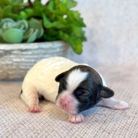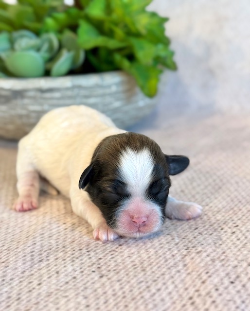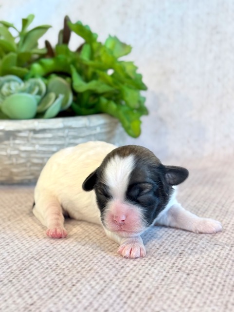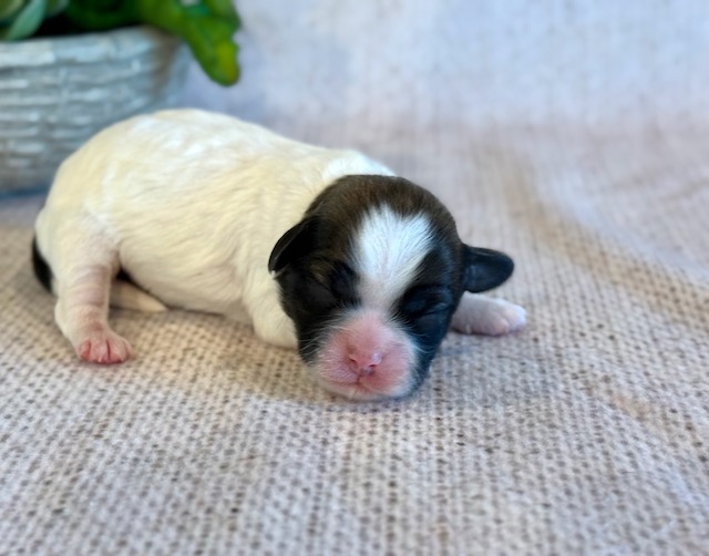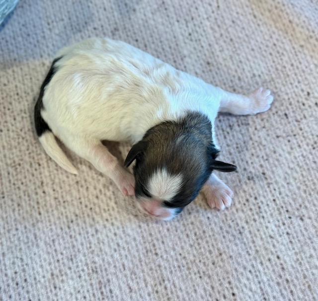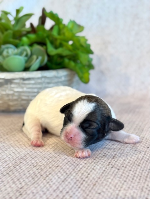 Scarlet is an adorable little ShihPoo! Her parents are Mylie and Homer, our registered Shih Tzu and Toy Poodle. I expect her to weigh around 10 lbs when full grown, she has a beautiful white non-shedding coat with black markings! Scarlet will be ready for a family around April 25, she can be reserved now.
