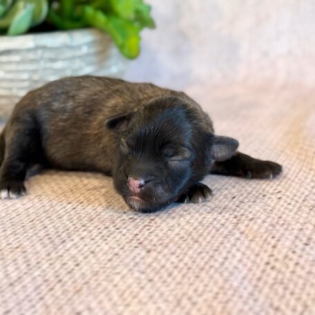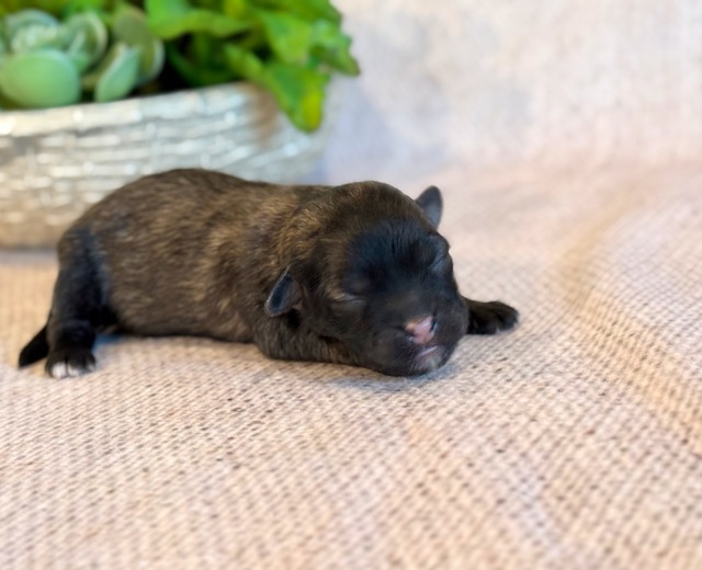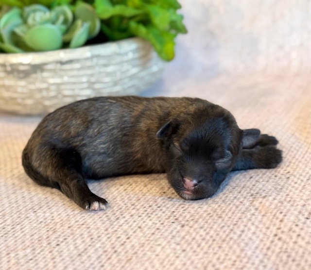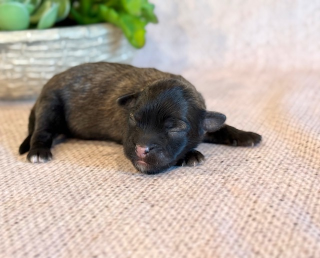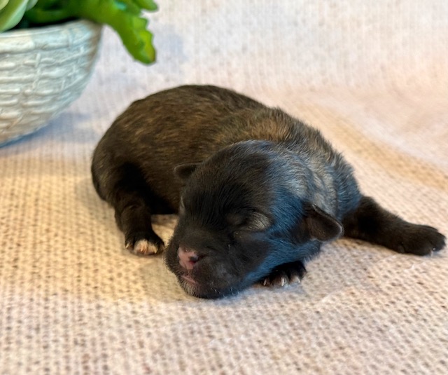 Skye is a cute little ShihPoo! Her parents are Mylie and Homer, our registered Shih Tzu and Toy Poodle. I expect her to weigh around 10 lbs when full grown, she has a beautiful dark non-shedding coat with white markings! Skye will be ready for a family around April 25, she can be reserved now.