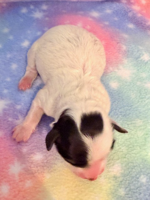 Taco is an adorable little MaltiPoo! His parents are Willow and Jade, our registered Maltese and Toy Poodle. I expect him to weigh around 6 lbs when full grown, he has a beautiful white non-shedding coat with black markings! He will be ready for a family around April 30, he can be reserved now.