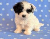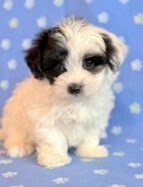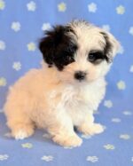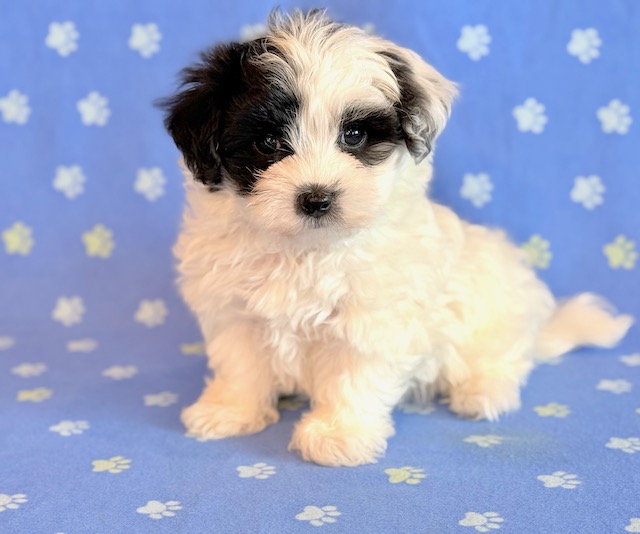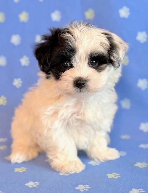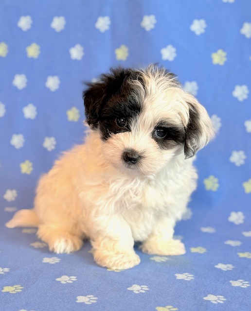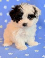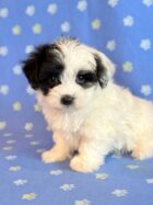 Taco is reserved for Max! Taco is an adorable little MaltiPoo! His parents are Willow and Jade, our registered Maltese and Toy Poodle. I expect him to weigh around 6 lbs when full grown, he has a beautiful white non-shedding coat with black markings! He will be ready for a family around April 30.