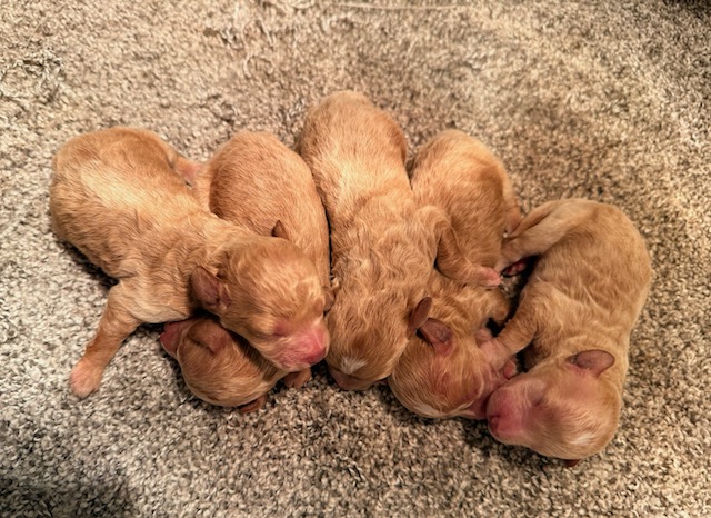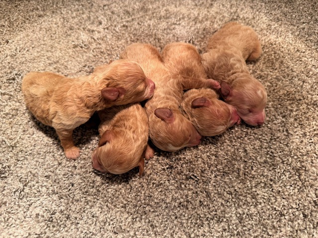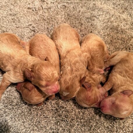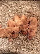 Wells is a precious little Miniature Poodle! His parents are Josie(11 lbs) and Homer(9 lbs), our registered Miniature and Toy Poodle. I expect him to weigh around 10-11 lbs when full grown, he has a beautiful non-shedding apricot coat! He comes with APRI registration. Wells will be ready for a family around May 4, he can be reserved now.