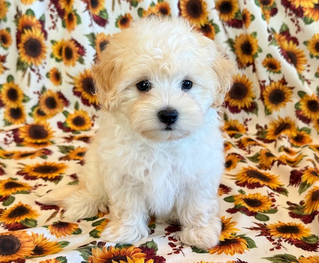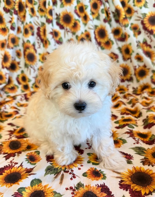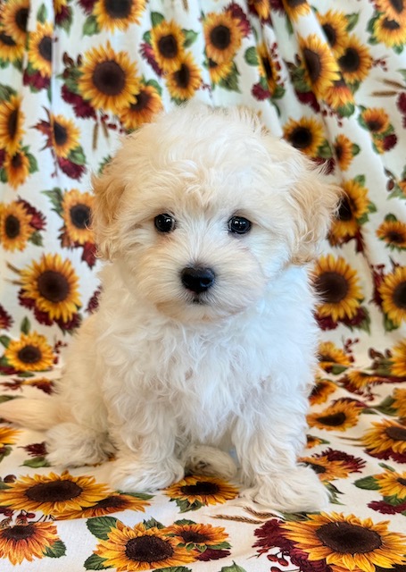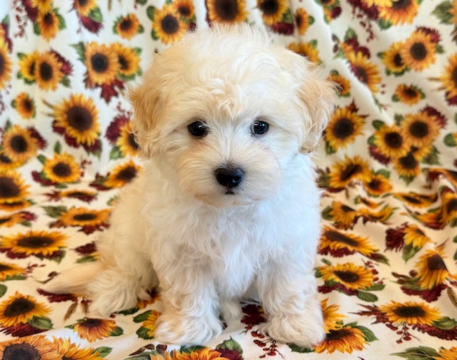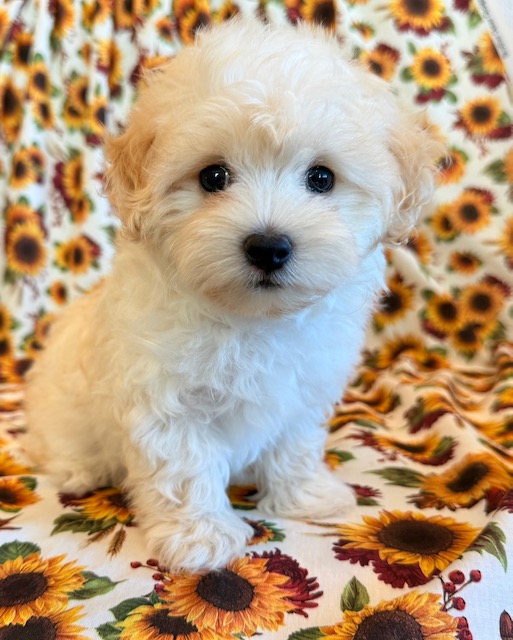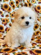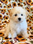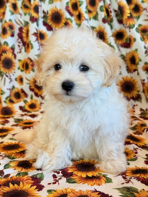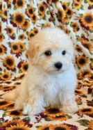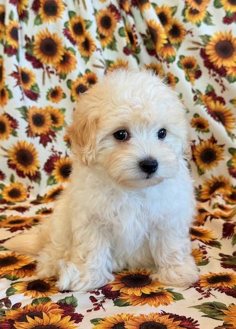 Wyatt is an adorable little MaltiPoo! His parents are Willow(6 lbs) and Howie(5 lbs), our registered Maltese and Toy Poodle. I expect him to weigh around 5-6 lbs when full grown. He has a beautiful non-shedding light apricot coat! Wyatt will be ready for a family around Oct. 16, he can be reserved now.